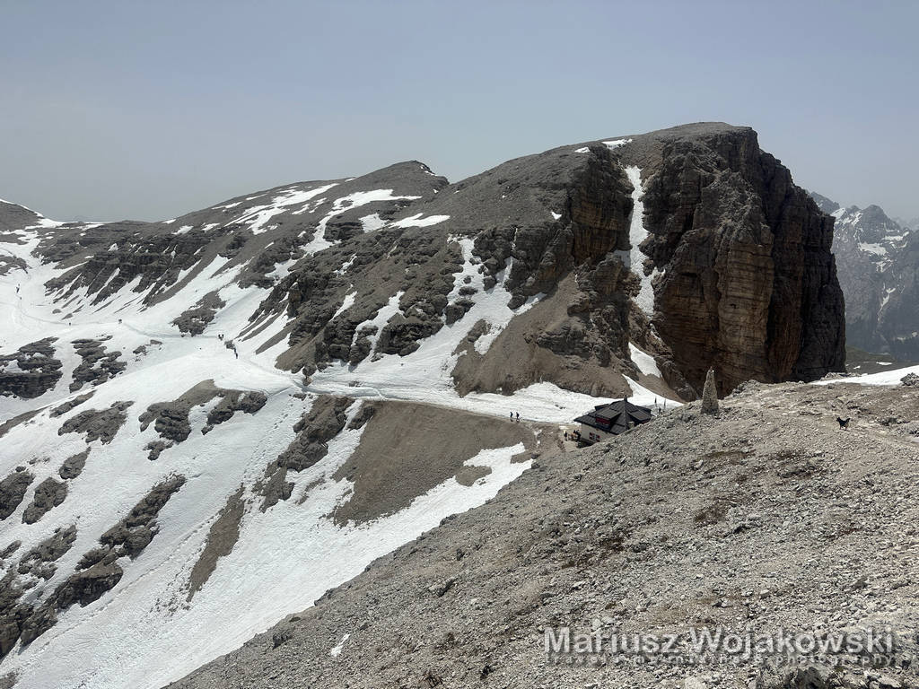 Po dotarciu na górę okazuje się, że trwa rozbudowa schroniska a helikopterami dowożą po prostu beton na budowę. Nasza dzisiejsza trasa kończy się na szczycie gdzie siedzimy kilkanaście minut kontenplując otaczające nas Dolomity. Nie mogło być lepiej. Nawet troche słoneczka wleciało na uśmiechającą się wciąż gębę.