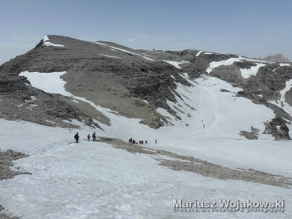 Piz Boe w słońcu i śniegu. Wykorzystujemy kolejną chwilę dobrej pogody. Każdy słoneczny dzień bez wyjścia w góry to stracony dzień. Nie ma co się zastanawiać? Jedziemy na przełęcz i idziemy do góry.