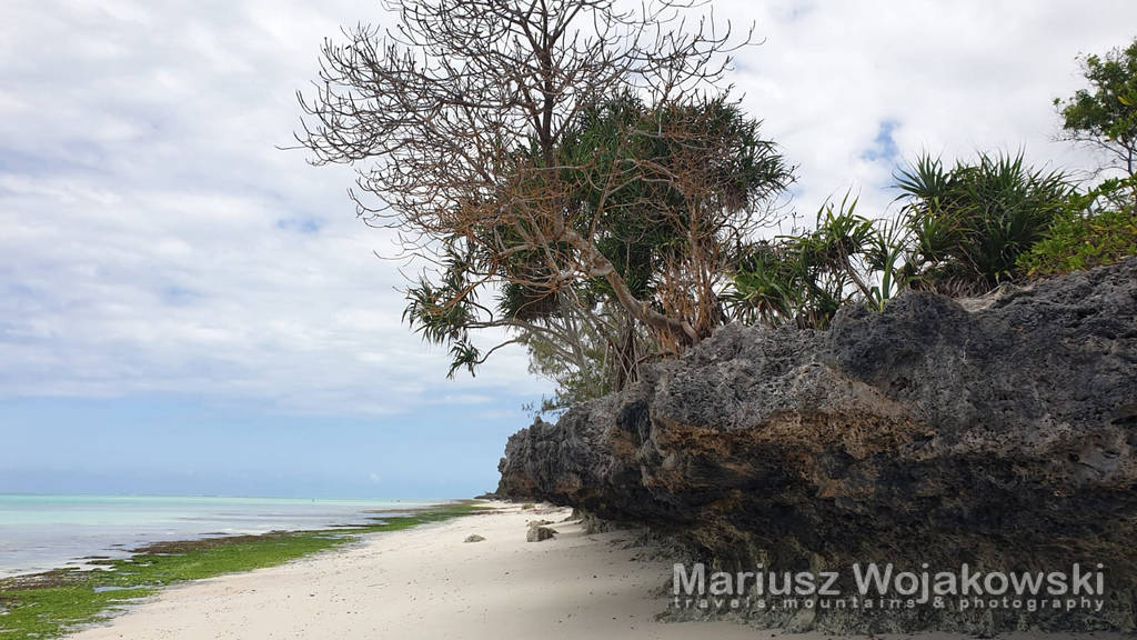 Sandbank blisko Nungwi na własną rękę to kilkugodzinny marsz po plaży. My trafiliśmy idealnie. Na lekko zachmurzone niebo i co chwilę przebijające się słoneczko wyciągające z wody zanzibarski kolor. My lubimy spacerować dlatego te kilka kilometrów to dla nas przyjemność. Bardzo mało ludzi. Nie ma Masajów. Jeśli zmęczyła Cię już wioska i plaża pełna naganiaczy to warto sobie zrobić oczyszczanie głowy. W czasie spaceru podziwiamy różne formacje na plaży. To kamienie. To duże nawisy skalne nad głową. Spokojne czy tez może opuszczone hotele. To wszystko tworzy fajny wyspiarski klimat.