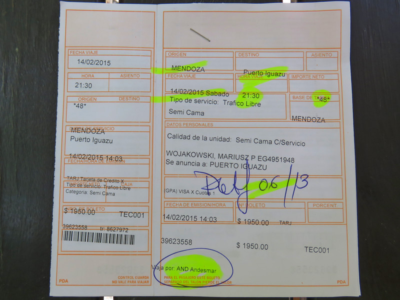 Skoro się rzekło a trzeba powiedzieć i b i c... Kupujemy bilety na autobus: MENDOZA - PUERT IGUAZU. Jedynym plusem tego połączenia jest to że jest bezpośrednie i nie trzeba się męczyć i nie stresować przesiadkami. Co jak się okaże w podróży z Salty do San Pedro już nie będzie takie bezstresowe!