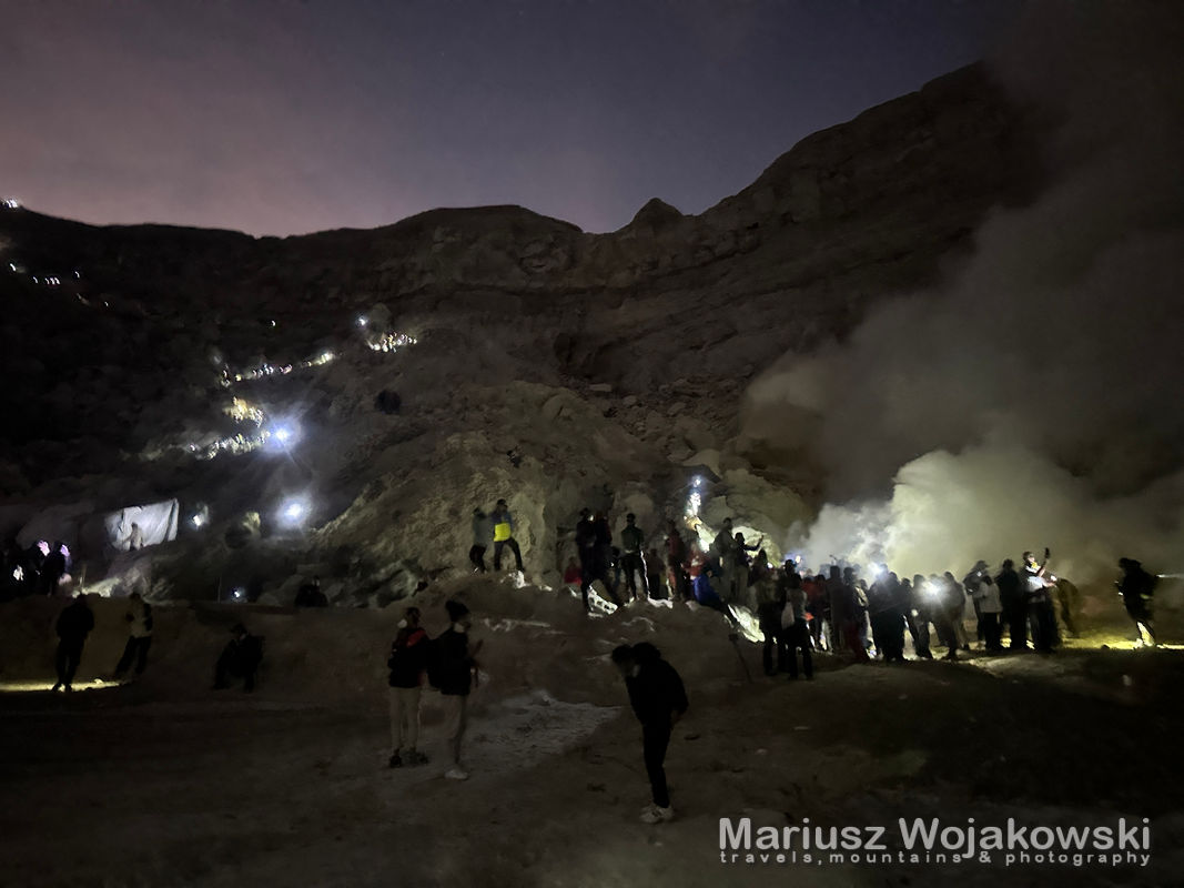 Trasa na szczyt Ijen nie jest długa – liczy około trzech kilometrów z przewyższeniem około 300 metrów – ale w nocy, po kamieniach i stromych fragmentach, wymaga uwagi i ostrożności. Wejście trwa zwykle od półtorej do dwóch i pół godziny, w zależności od kondycji i tempa marszu. Ostatnie 300–400 metrów przed kratrem bywa najbardziej wymagające, strome, sypkie kamienie i momentami błoto potrafią skutecznie wybić rytm marszu. Dlatego lepiej iść spokojnym tempem, niż ryzykować pośpiech. Najtrudniejszy odcinek to zejście do krateru. Wąskie scieżki każdy chce iśc jak najszybciej skręcić nogę bardzo łatwo.