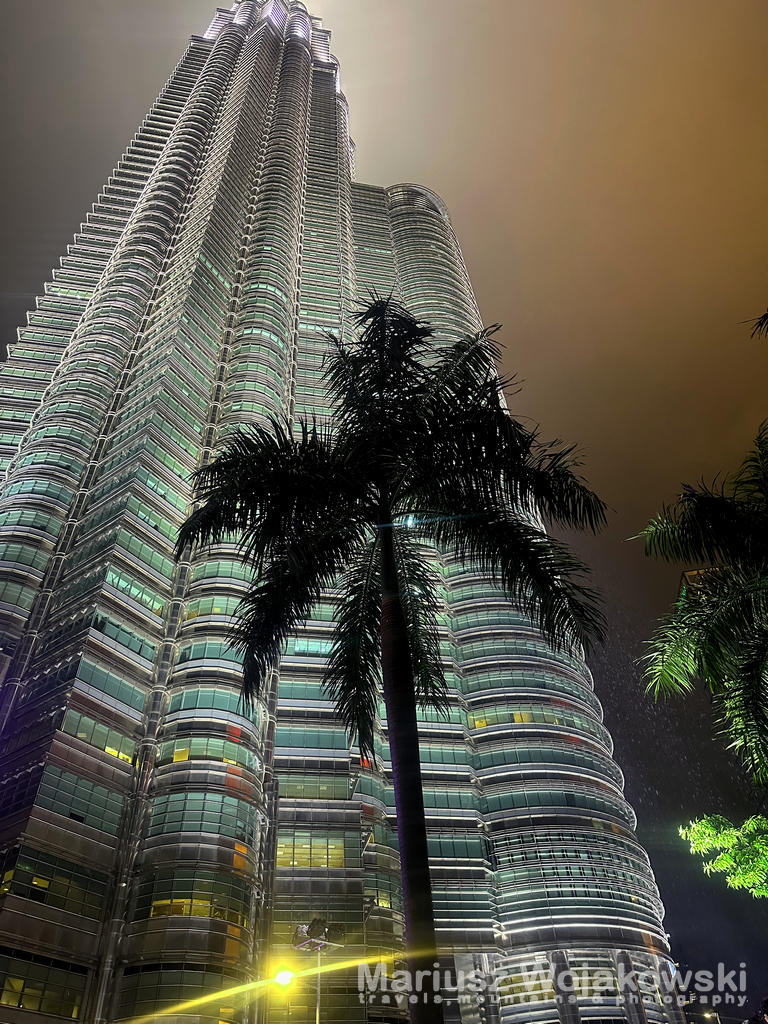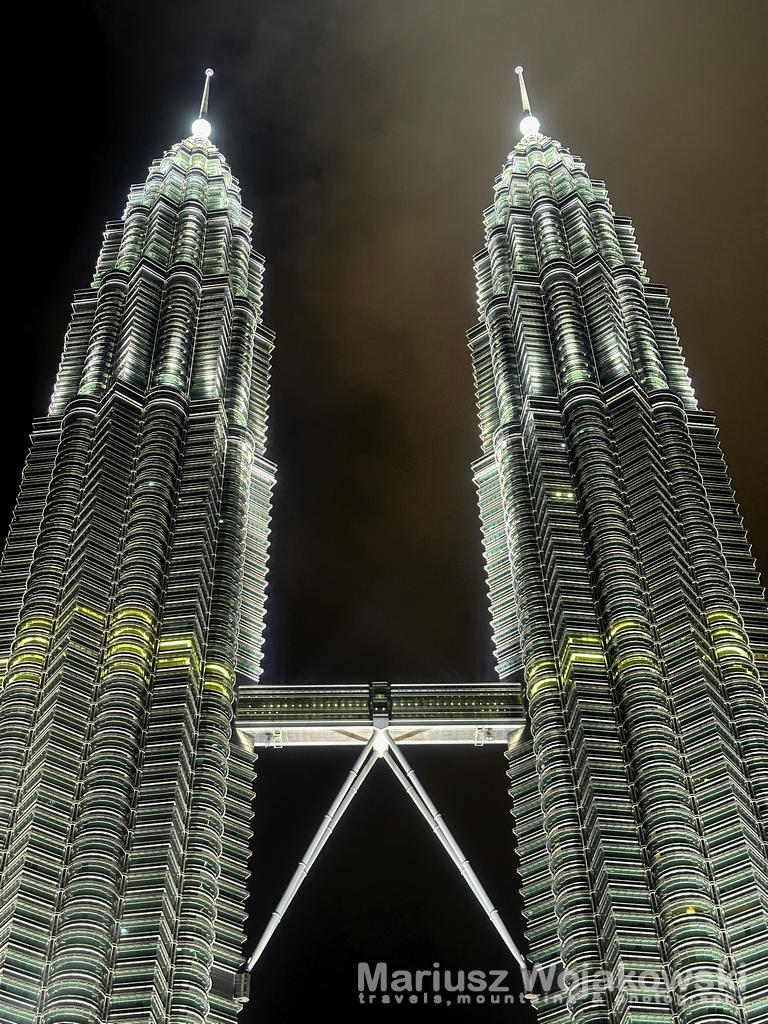 Idąc w kierunku Petronas Towers podziwia się ich charakterystyczny kształt, który widać z różnych części miasta. Ale już bezpośredni kontakt z ogromem, jednkowo odwzorowanych pieter robi ogromne wrażenie. One sa po prostu wielkie! I nie ma takiej siły, żeby nie zobaczyć ich po zmroku jak zaczynają się powoli oświetlać. Jest efekt wow!! Wystarczy biełe światło i odpowiednie podświetlanie szczegółów żeby wywołać zachwyt na gębie. No piękno prostoty architektury. Takie rzeczy mi się podobają.