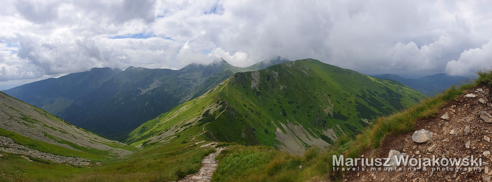 Wychodzę spokojnie w stronę Grzesia. Widać wszędzie że musiało tutaj nieźle padać. Dużo błota i naniesionych przez wodę kamieni. trzeba uważać. Nie pada. Reszta to już tylko czas. Czasami wiatr rozwiewa chmury i można nacieszyć oko. Po słowackiej stronie pogoda duuużo lepsza. Od przełęczy szlak już graniowy więc jak znowu chmury zasłaniają polską stronę gór można siepocieszyć słowacką stroną! Szkoda że jest tak zimno.